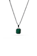 Made from stainless steel with a silver plated finish. The green stone is natural malachite, and each one has its own unique lines.